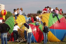 Die Bälle sternförmig aneinander auf dem Boden legen, so dass die Bälle mit der Ventilöffnung nach außen liegen. Dann darüber das Netz legen, die Bälle sollten ungefähr in der Mitte darunter liegen. Mit dem Gebläse werden die Bälle der Größe nach aufgeblasen. Die Ventildeckel werden mit einer Münze zugeschraubt. Die Bälle möglichst nah unter dem Netz zusammenschieben, dann das Netz zuerst an den 4 Ecken mit Erdnägeln im Boden befestigen, danach die Seile des Netzes.