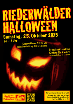 Alle kleinen und großen Gruselfans zwischen 4 – 12 Jahren sowie die Eltern sind herzlichst eingeladen zum traditionellen Riederwälder Halloween. Die Kinder und das Spielplatzteam verwandeln das Gelände des Abenteuerspielplatzes Riederwald in eine schaurig schöne Grusellandschaft mit Wassermonstern, Hexen, einem Geisterschiff, einer Geisterbahn-Rollenrutsche und vielem mehr! Auf der Bühne gibt es eine Disco und selbstgemachte Limonade. Diese Attraktionen sind auf die Altersgruppe der 4- bis 12-jährigen mit Eltern ausgerichtet und versprechen ein wohlig gruseliges Vergnügen. Die Kassen sind ab 13.30 Uhr geöffnet, die Veranstaltung beginnt um 14.00 Uhr. Es wird ein Teilnahmebeitrag von € 4,- pro Person erhoben und für das leibliche Wohl ist gesorgt.