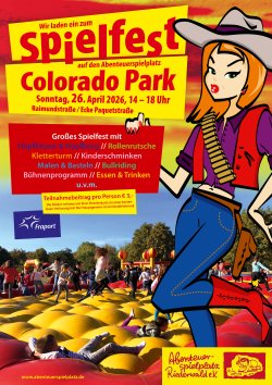 Schon seit vielen Jahren veranstalten wir auf dem Abenteuerspielplatz Colorado Park im Frühling ein großes Spiel- und Familienfest. Um den Abenteuerspielplatz Colorado Park herum werden Rollenrutschbahn, Hüpfkissen und weitere Spielgeräte aufgebaut!. Es gibt ein tolles Bühnenprogramm. Mit dabei ist das TriTra Puppentheater und es gibt einen Tanzauftritt der FKG Narrhalla!