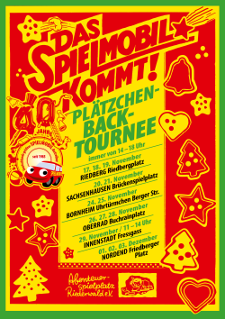 Wir laden Euch ein zur Plätzchenbacktour mit dem Spielmobil, das auch in diesem Jahr in der Vorweihnachtszeit durch 6 Frankfurter Stadtteile fährt.